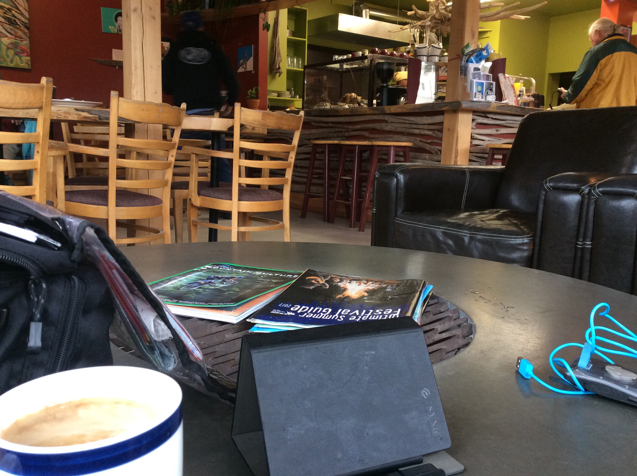 I’m now in a very cool cafe in Golden, Jita’s Cafe, sitting out the rain and listening to some high-end mountain bike guys chatting about sponsors, competitions and the entertainment circuit. Every other guy in here this morning has been a biker, meeting up to drink lots of coffee and plan their day’s routes. This is not a place where people will ask you about riding your boring old road bike. Not enough suspension to discuss. Mind-boggling to think of off-road descending in this weather. I’ll stick to the asphalt, thanks. Although I failed yet again to get through to Susie, I had a long FaceTime call with my lovely mum and dad back in sunny Cambridgeshire (sorry Dad, you’ve been cut off!):