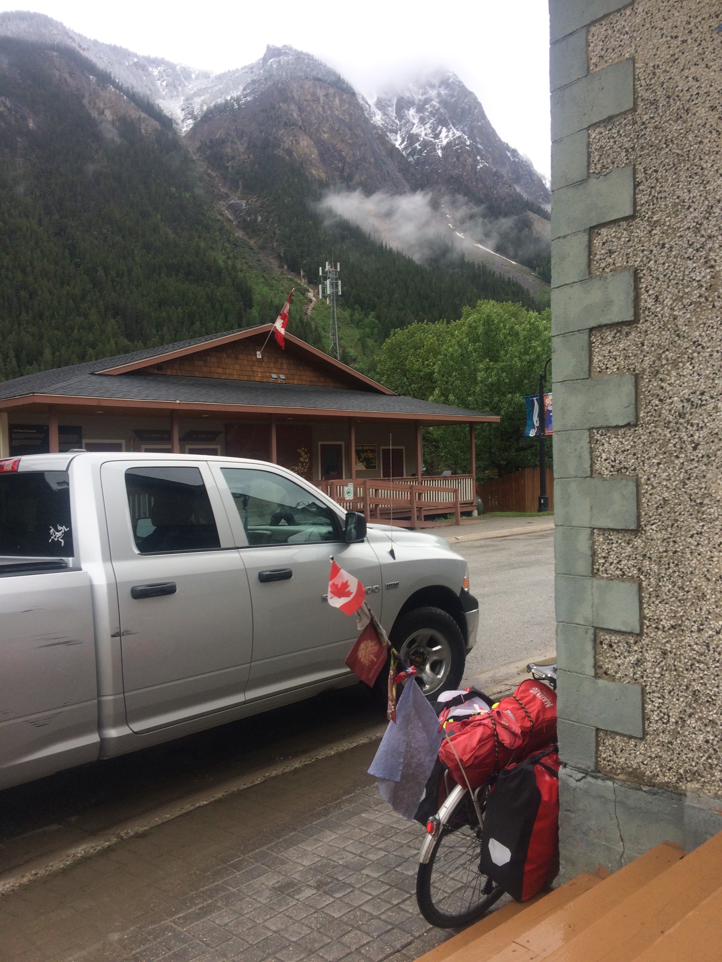 I was travelling through the Yoho National Park, going over Kicking Horse Pass then down to the tiny town of Field, just 4 miles from my home this evening, Kicking Horse Campground. A highlight of the day was deciding to venture off the highway and explore Field. I was so cold by now (mainly toes and fingers) that hot coffee and somewhere to dry off a bit was all I wanted. I found my way to such a great cafe/bar/restaurant/liquor store, called The Siding, where I parked my bike and settled in for several free refills.