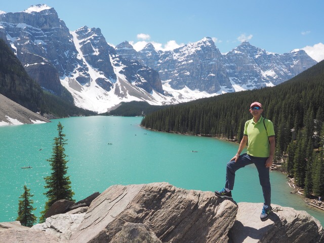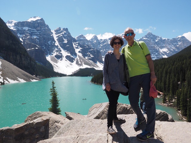 The plan then was to go and visit Moraine Lake, the iconic Rockies image, and also the beautiful photograph on my JustGiving page which some of you have already spotted. Seeing a big queue of cars to head up to the lake, we went instead on to Lake Louise, glimpsed the famous hotel before being sent back down the hill towards an overflow car park G&S were amazed at how busy it was for a Monday, and think the 150th celebrations, including free parks access, could be the culprit. Anyway, we tried Moraine again and the queue was shorter than we realised, got up there pretty quickly and parked miraculously close to this: