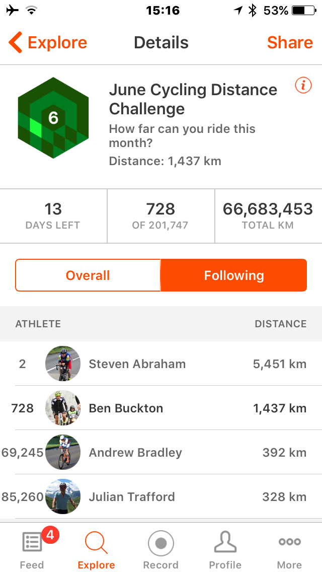 I’m quite proud of one Strava (a kind of cyclists’ Facebook, for anyone unclear) statistic at the moment. You can sign up to challenges each month to compare your achievements with the nation, and I’m normally languishing around 58,000th. For distance this month, however, I’ve climbed into the big league. I fully expect a professional contract to be on the table shortly.