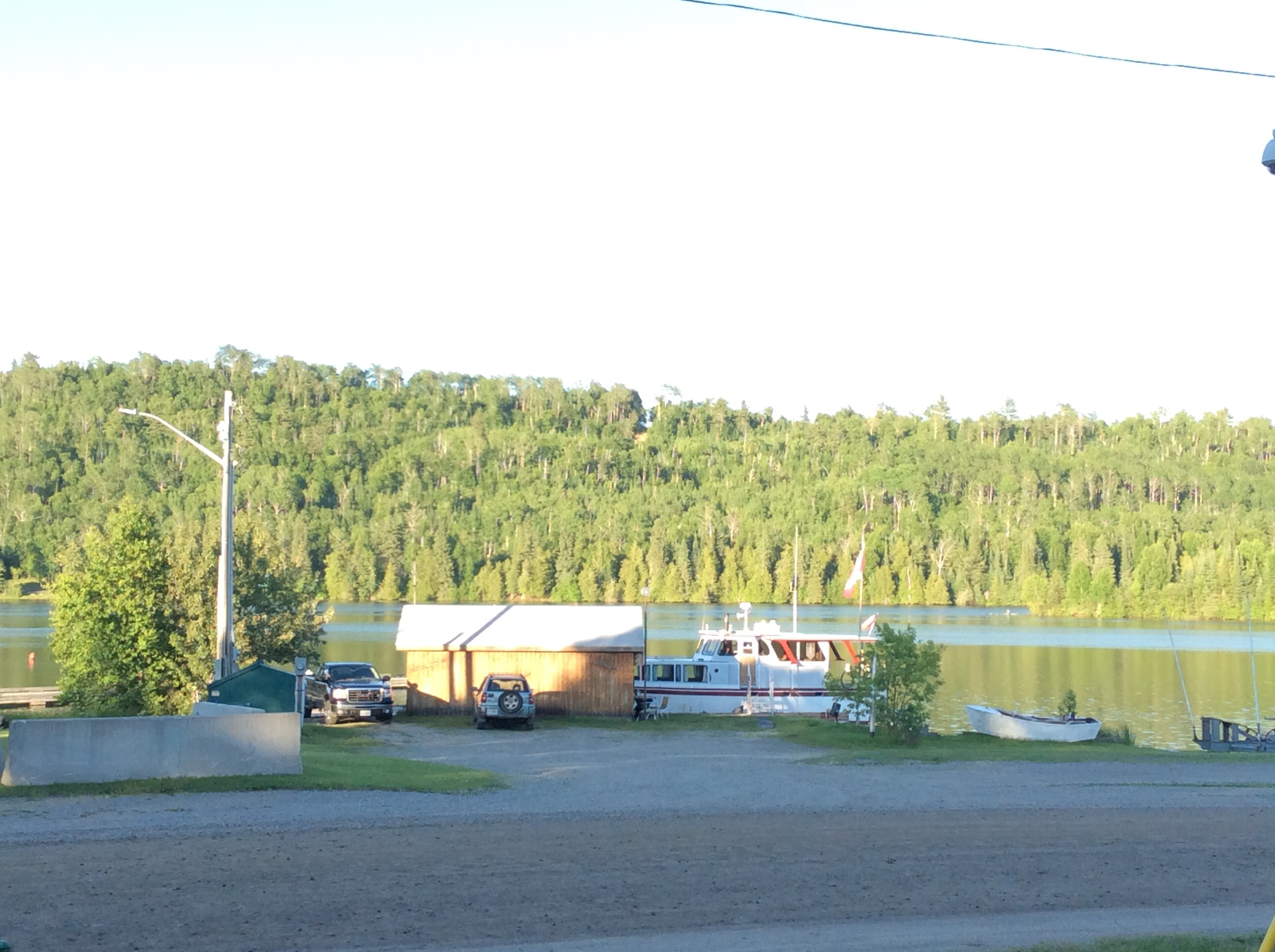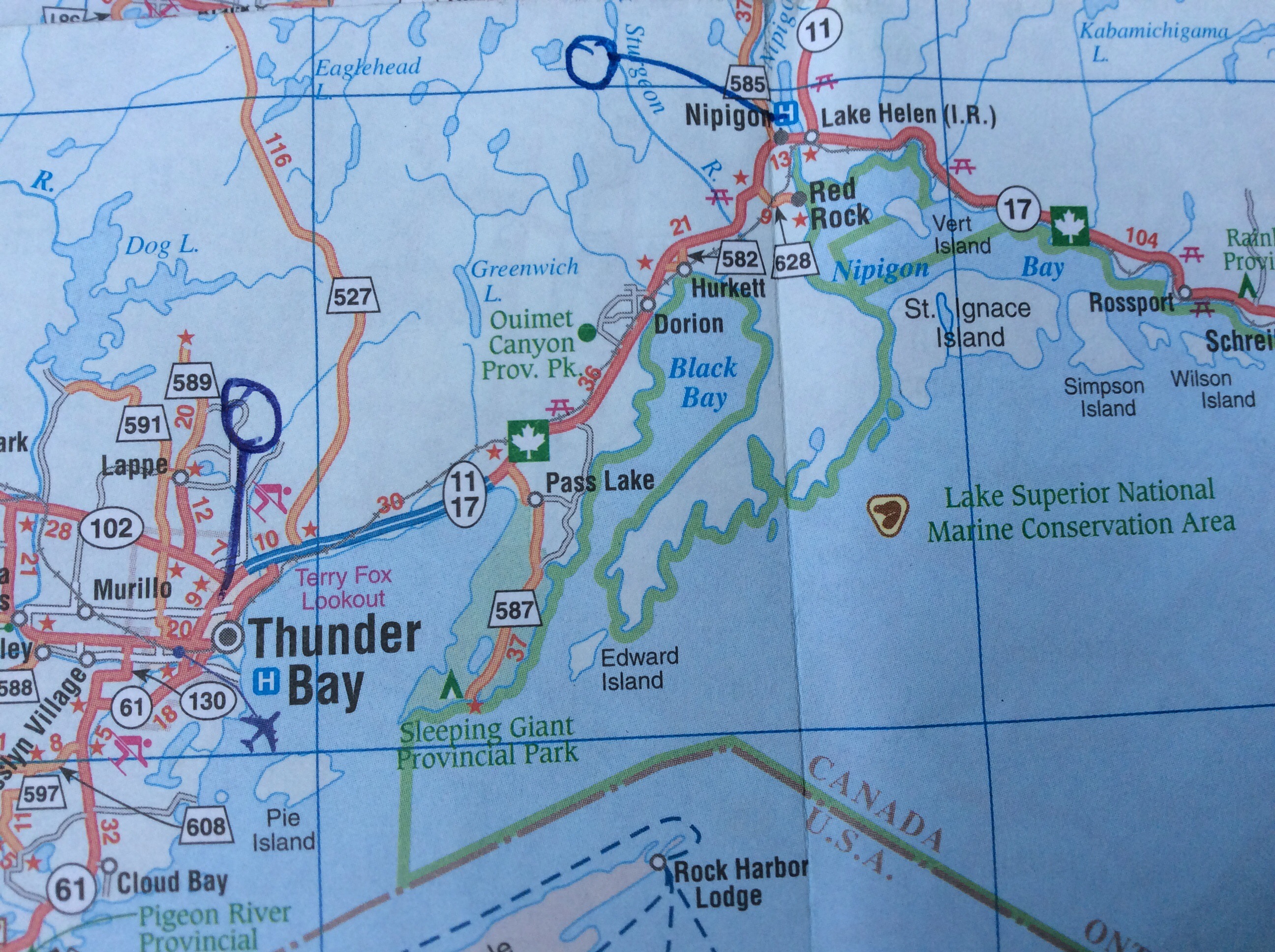 I had breakfast again with the Calgary Two after videoing a short thank-you song for Beechwood in my room, and we arranged to meet up later at the same campground in Nipigon, down by the river. I had to hang around in town to see if the bike shop (Rollin’ Thunder Bike & Ski) would open at 10am, which they did. I met Dan, the only guy working there this morning, who sorted me out with a new chain, and since I generally change the cassette at the same time we did that, and he thought my middle chainring was pretty worn, so that went too! When I thought about the amount of work these drive-chain parts have been doing over the last few weeks, pulling all my heavy pack and me over mountains and across prairies, I’m amazed there isn’t more that needs doing. He did a great job, we chatted for a while, then some regular customers appeared and we all watched the Tour de France for a while longer, stopping with 25km still to go so that they wouldn’t know the result before seeing the highlights this evening. This delay was the first of several very welcome distractions throughout the day. Everyone I spoke with had a story to tell and I was happy to take the time to hear it.