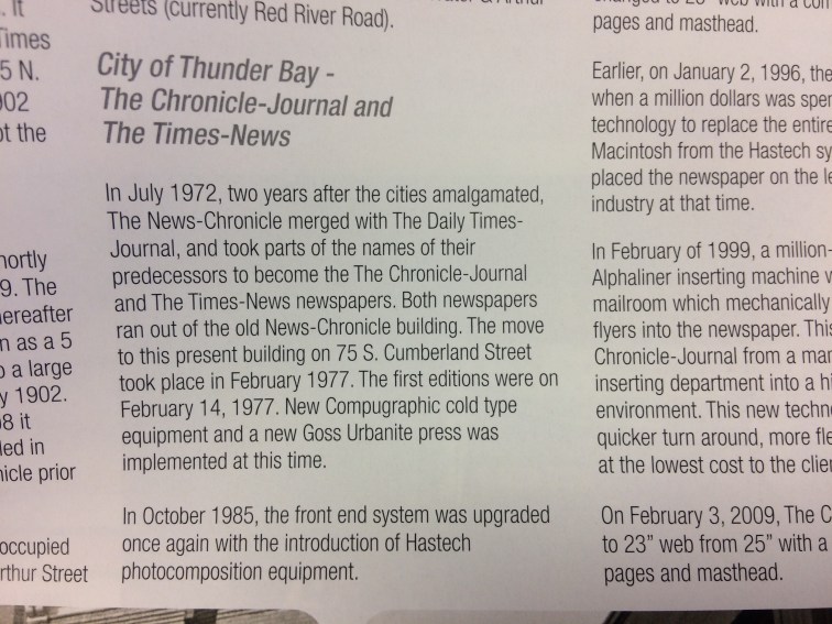 We were overheard by the owner when I asked the Calgary Two if they knew why the local Thunder Bay paper was called the Chronicle Journal, and he said “That’s crazy, I just read a piece about that, (flicking through a magazine)… here you go!”