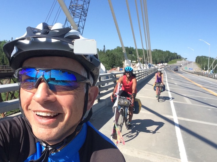 Swimming yesterday in the Nipigon River I noticed the construction of a new bridge going on, up on the highway we were to take today. It’s a suspension bridge but with a difference. Normally you’d expect the towers in the centre to run into the ground, with the road sections hanging cantilevered from them. On this bridge the towers rise straight out of the road, nothing underneath. It’s so disturbing to look at that yesterday I got my binoculars in case I was being fooled by tree cover or something. But no, there it was. I only got a photo of us crossing it, but I’ll look for some info on it:
