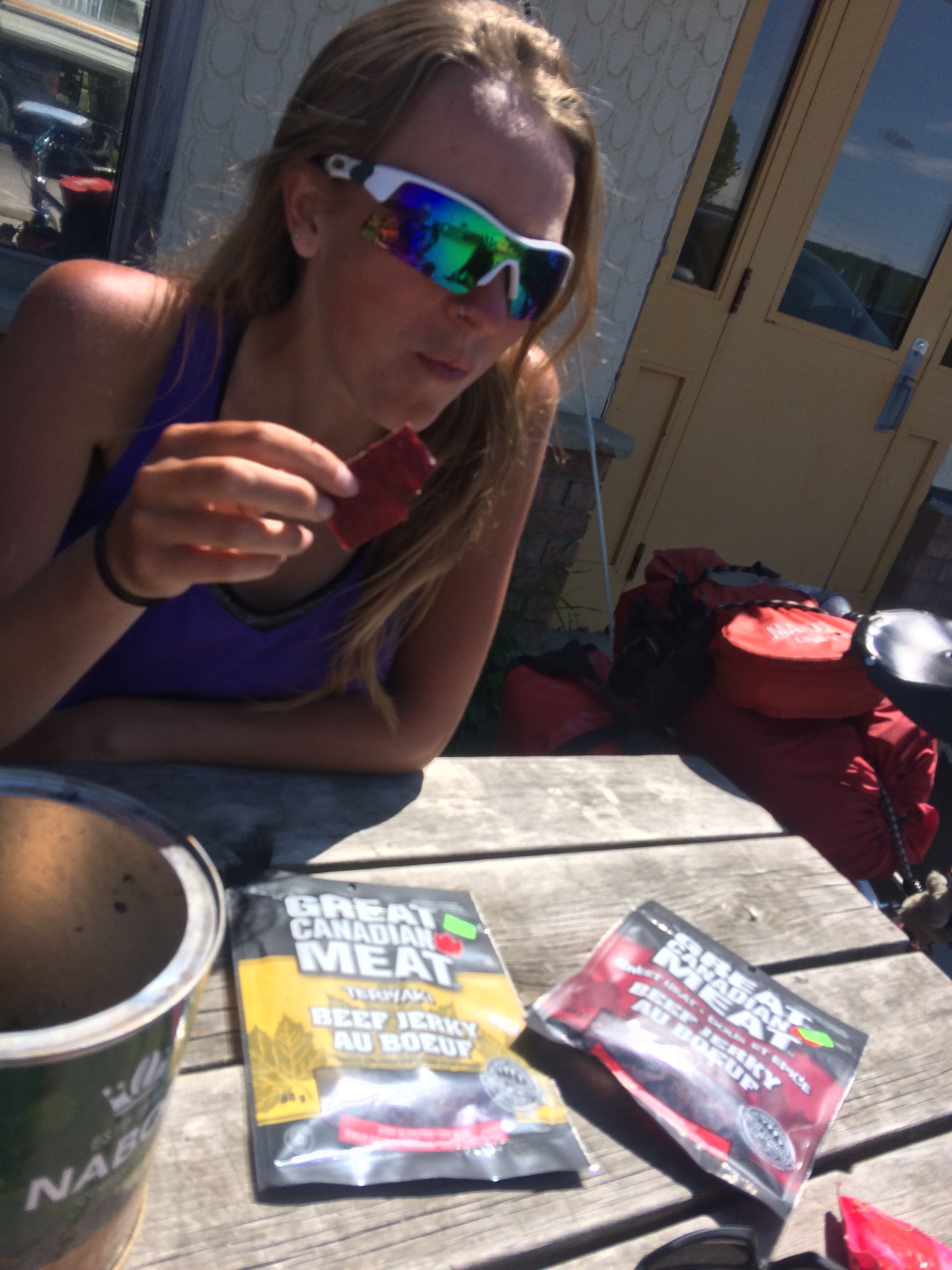 Day 37 – Nipigon to Rainbow Falls, Rossport Provincial Park. A hot sunny day spent riding the stunning but very hilly road that follows the North Shore of Lake Superior, with Nadeer and Kaitlin. We’ve discovered a shared interest in stopping whenever coffee, cookies, cold chocolate milk (the best), and now beef jerky, are available.