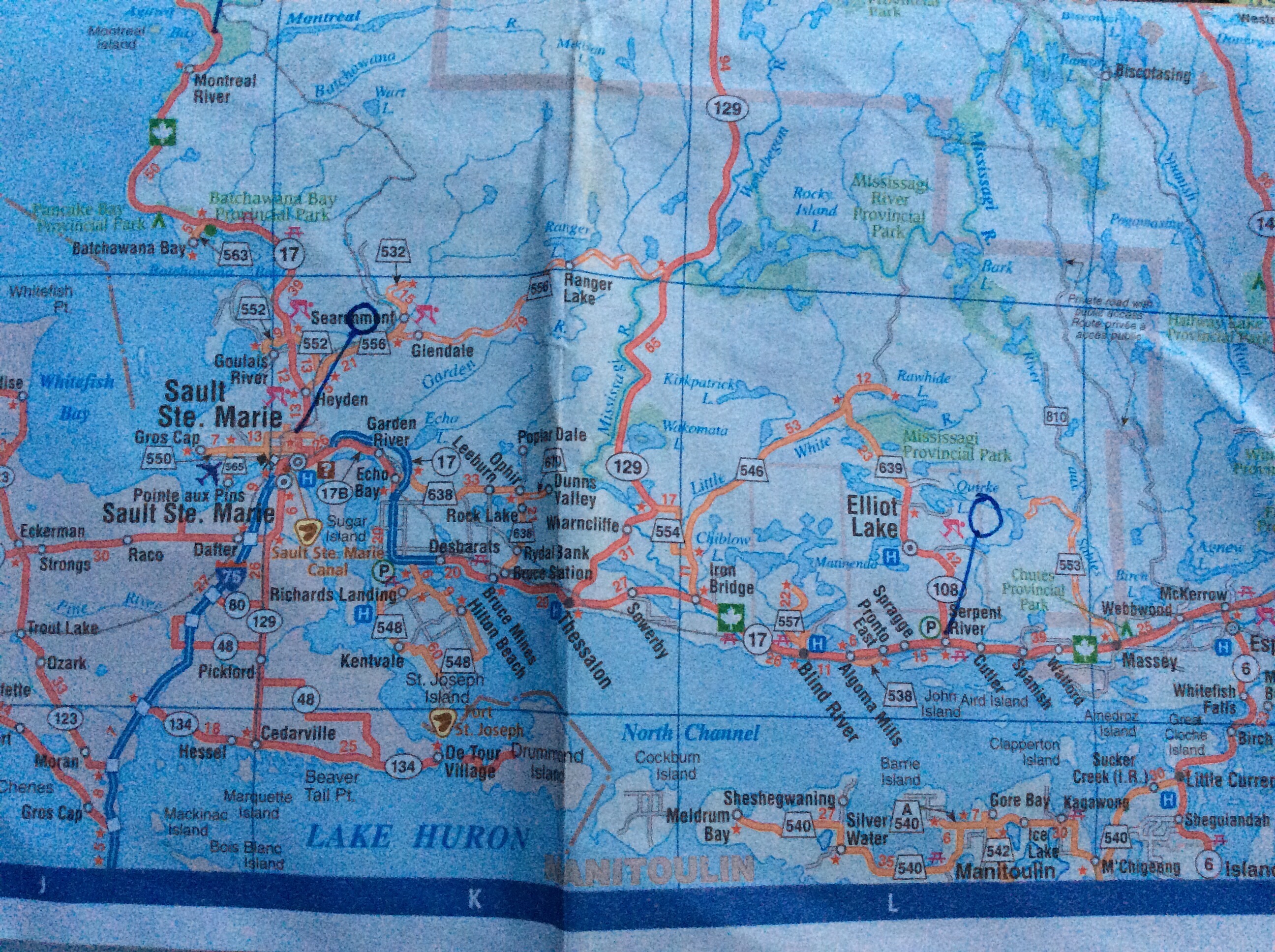 The site here in Serpent River is another good one, with lots of space, a shop open until late, great showers and an outdoor pool. I was met by a young lad doing a few very impressive wheelies on his bike, and I threatened to have a go on mine. Once the tent was up and I’d showered, I had a therapy session in the pool on my shoulders – backstroke is the best thing ever for that! Then back at the tent I was greeted with a “knock-knock!” from neighbouring camper Stacey (mum of Brad doing wheelies), asking if I’d like to come over for a burger tonight. I was so touched by them thinking to invite me, and accepted before she’d finished asking. Stacey and her husband Dave plus Brad and Cass their two kids (don’t forget the rescue chihuahua Jack who can open a grill with his teeth if there’s food inside), from Philadelphia, were travelling with their relatives Bill and Catherine from near Windsor, Ontario. We had a great evening chatting about learning music at school, their jobs, and enjoying the superb home made burgers courtesy of Bill, (who also turned out to be a guitarist) and I really enjoyed being the temporary part of a family camp out. The uke made a brief appearance, plus a short uke-club-style tutorial for Brad and Cass (sorry guys, I can’t help it). They had a fire going and they taught me how to make a proper “s’mores”, using my Swedish toasting prongs for the marshmallows for the first time on this trip! I had to say goodnight a little earlier than I would have liked, since there’s always quite a lot to do before turning in. Thanks so much for a great evening here on the edge of Lake Huron guys!