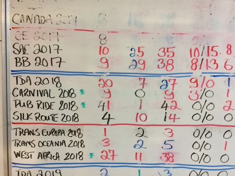 This big whiteboard in the office is where they record how many have signed up for each upcoming ride – it’s an incredible list of choice routes. How many once-in-a-lifetime rides can you do? Note the healthy stats for the intriguingly-named Pub Ride 2018, from Ireland to Copenhagen via, well, pubs! (Canada 2017 is rubbed out because it’s underway). For anyone considering a big cycling adventure but not keen on riding alone, I strongly recommend a visit to their website to see the mouthwatering trips they have planned: