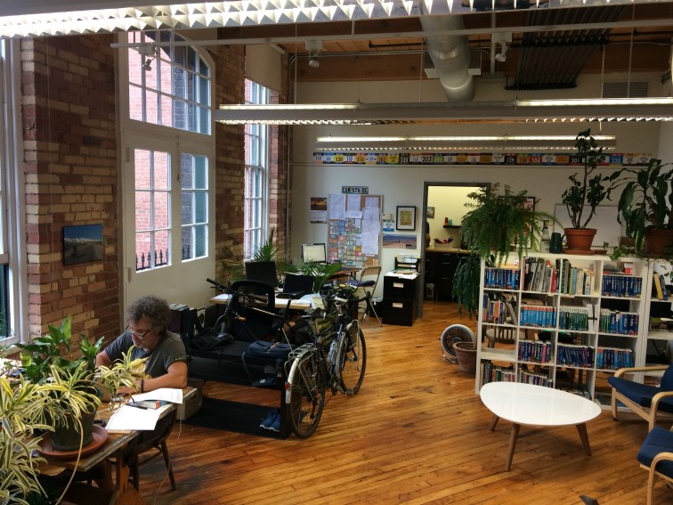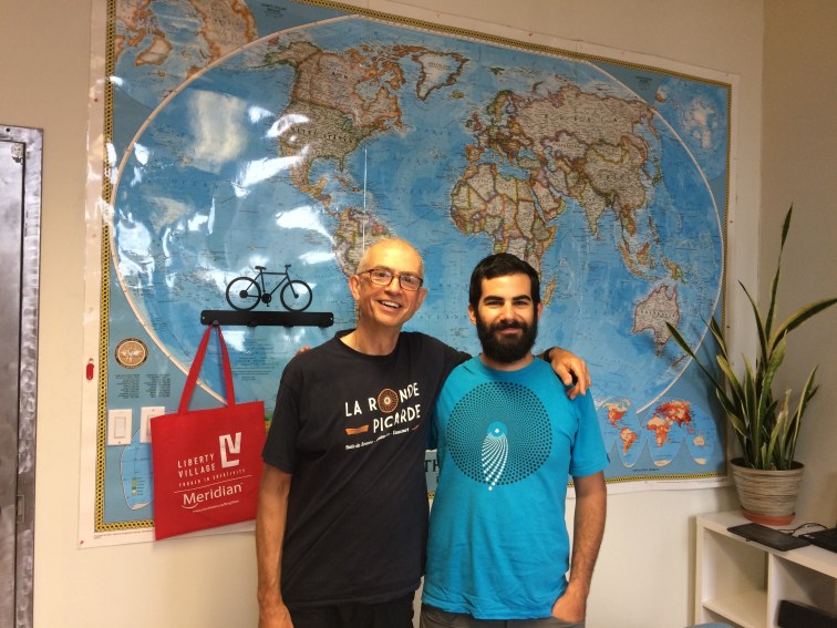 I cycled a few blocks west from our apartment today to pay a fascinating visit to FotB Micah Markson’s (see Crossingcanada2017 blog in Vancouver) workplace with TDA Global Cycling, the nerve-centre of every bike expedition that they put together. There is currently a Trans-Canadian group on the road, approaching Toronto as I write, that I might yet bump into during Stage Two of my trip. They cycle similar routes and distances as me, but have a van as a support vehicle and all accommodation and food handled for them by TDA. He introduced me to Brian and Mike, his colleagues at TDA – Micah has many jobs in the company, from mechanic to route planner to “sweeper” (what I would call broom wagon) which is the place at the back of the big group looking after the last rider (or lanterne rouge on the Tour de France). This might enable him to have a little doze under a tree from time to time, but I have a feeling than running these trips is a massive effort for all involved, with all the support they offer their clients.