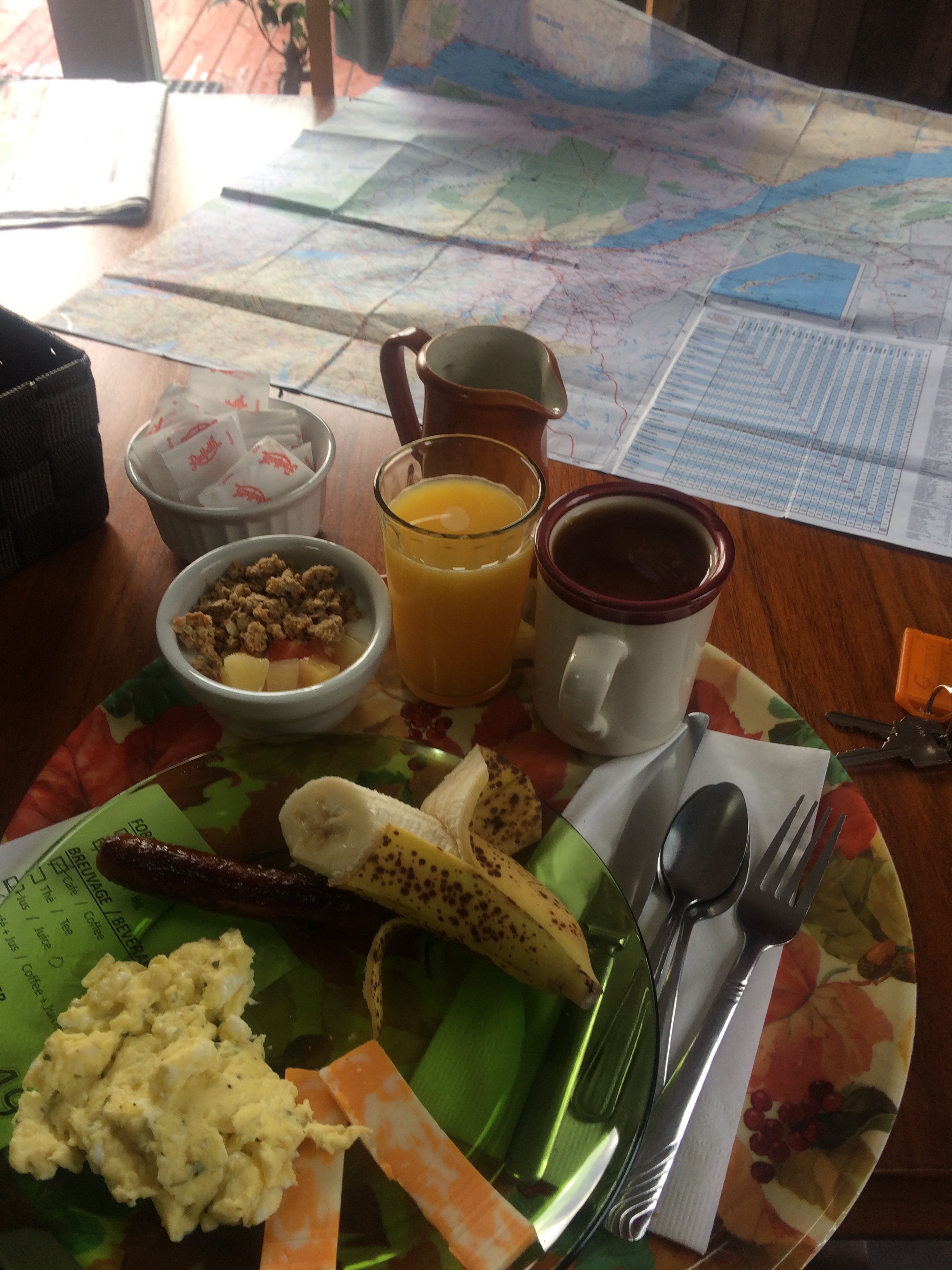 I found I was no longer alone in my Pavillion this morning. One of the other rooms had been taken by Roy, on his way home to near Halifax with his new Subaru car, picked up in Montreal. It was what he called a ‘standard’, or what the British would call a manual, and was so rare that he was willing to fly all that way just to get hold of one. Some dealers, he told me, had literally never seen manual shift. We had breakfast together over my big map for route planning:
