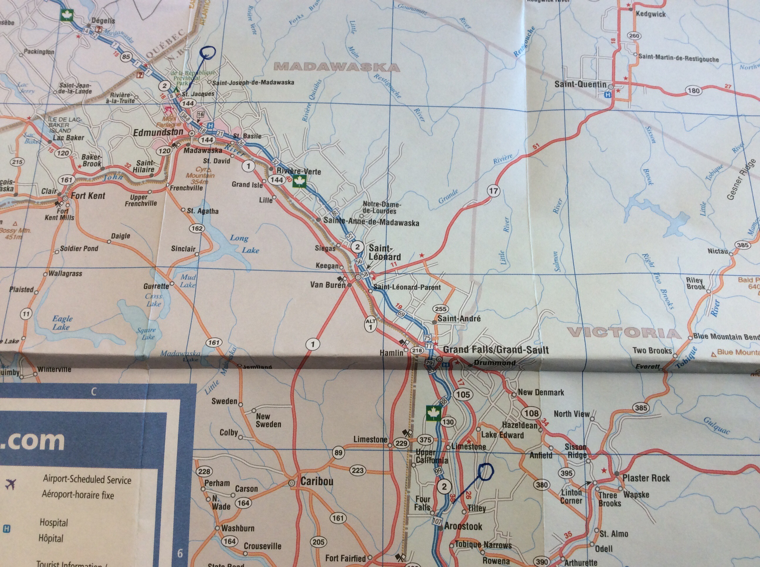 I had my 2nd breakfast/lunch today after 50km of TCH at Tim Horton’s in Saint Leonard, where I ate pretty much the whole menu. Some days, I JUST HAVE TO EAT. Plus two large dark-roast coffees and a chocolate milk. Blogging is much more fun on a full stomach. After phoning Susie in Toronto her Aunt Mayta reminded me that I’d lost an hour when I crossed into New Brunswick, which is why the TV Guide was so confusing last night, so my stop here at Timmy’s was for even longer than I realised. Time to leave…