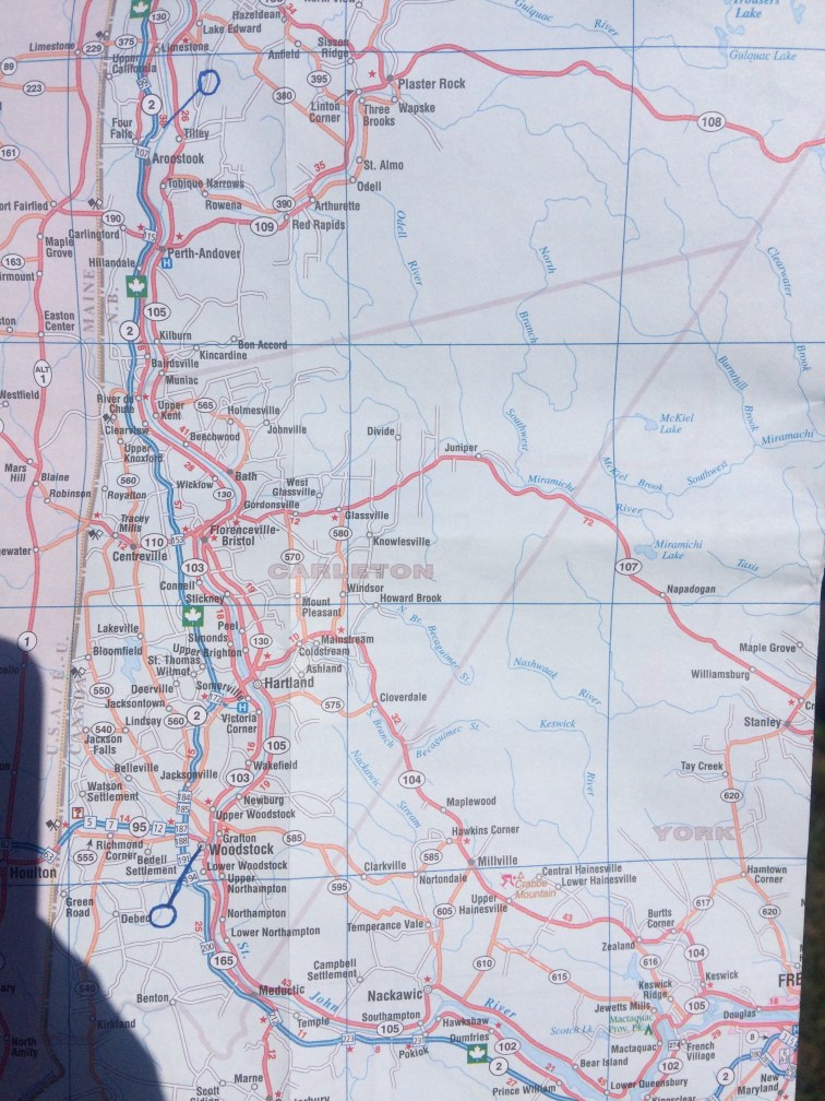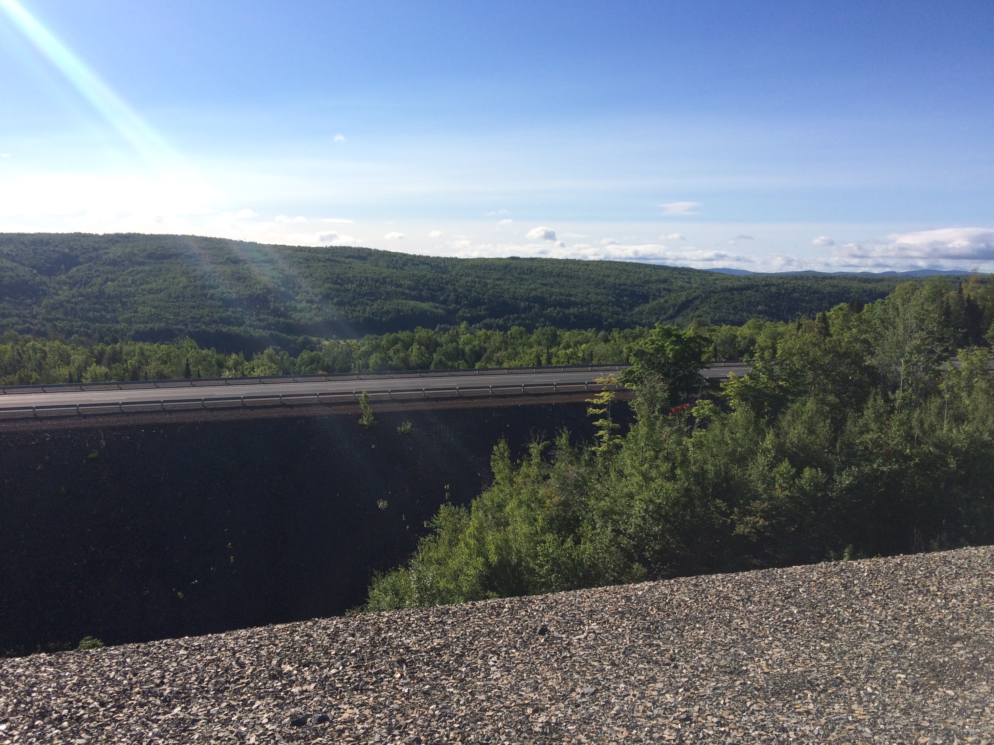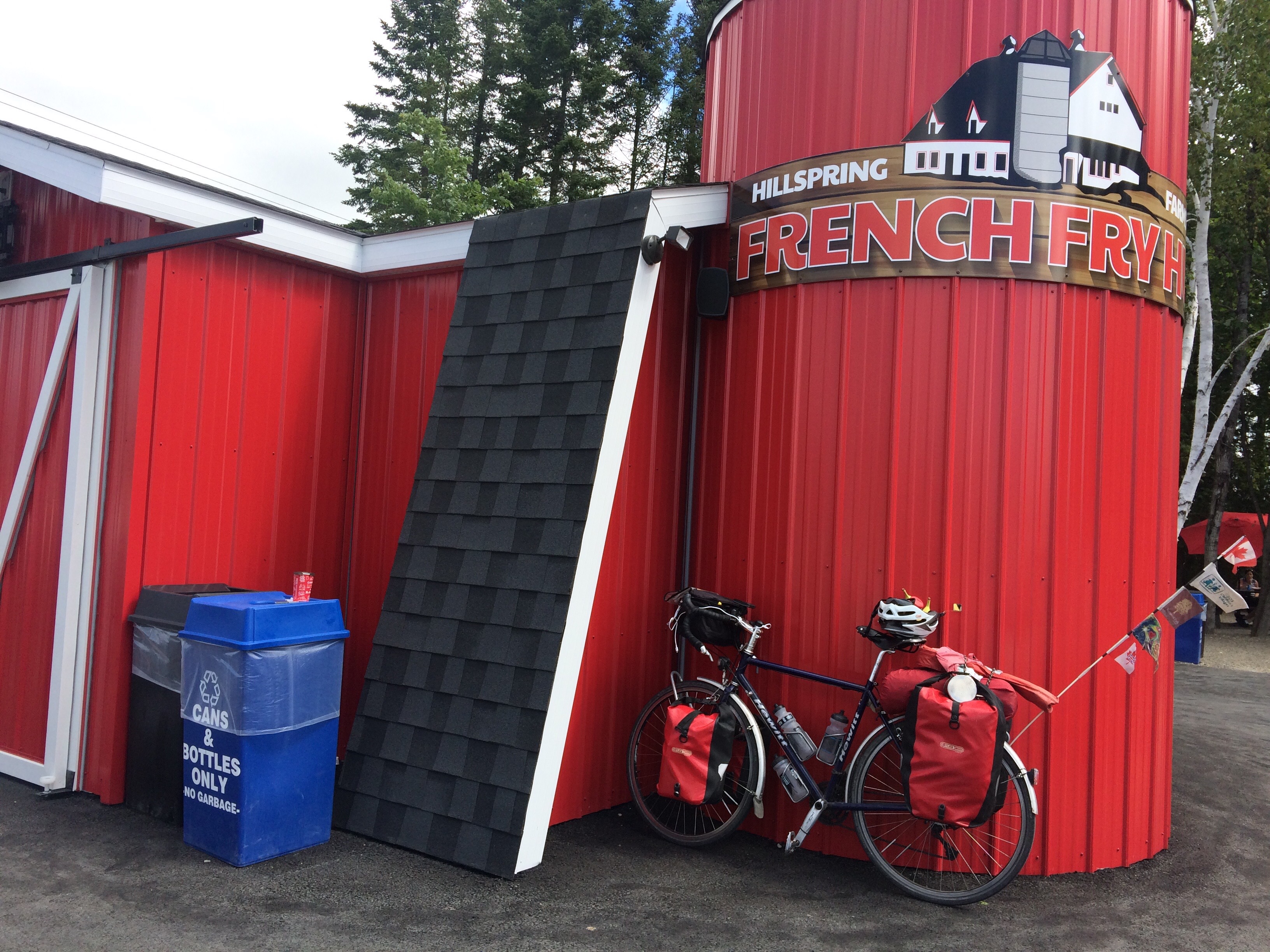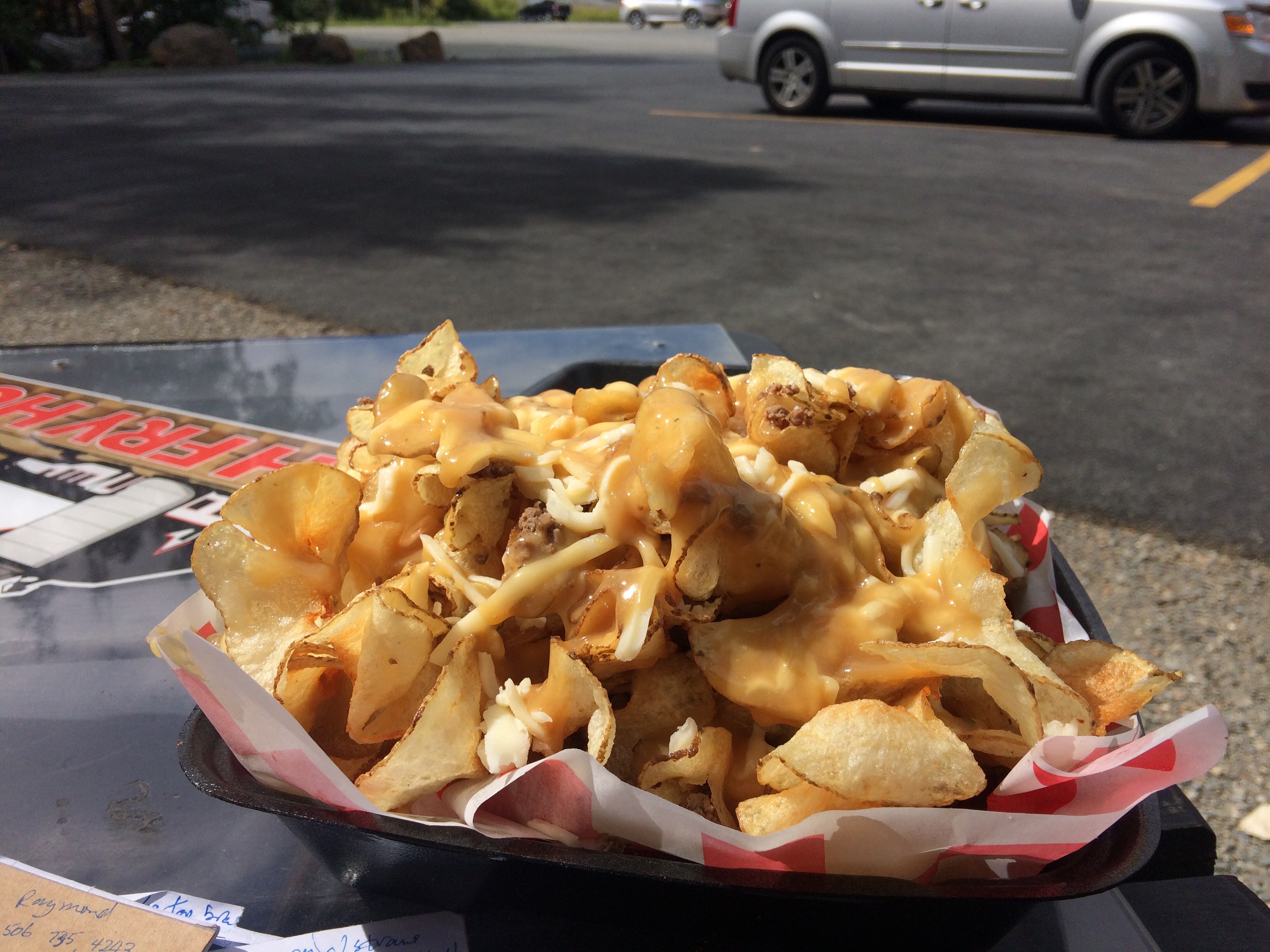 I did my now-normal thing of getting 50km in the bag really early then stopping for a good long brunch break. Today I rocked up at this poutine joint which was just opening as I propped up my bike (it’s a national holiday day bu the TCH services all seemed to be open. Unfortunately here was no wifi so I couldn’t call Susie who would be safely back home in England by now, or so I thought…They took my order (“Angus Poutine with Curly Fries”) but couldn’t give me change as the drawer of their till had jammed shut. The entire staff of five were gathered around it, jabbing vaguely with a butter knife and banging it hopefully whilst a queue was forming behind me. “We’ll call you when it’s ready!” they said, so I went and got some coffee from another spot and sat listening to some country music on the cafe sound system (also used to tell you your food’s ready).