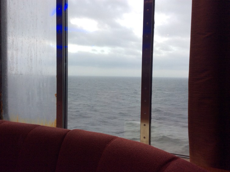I’d brought food with me, so got a beer and ate, read, put my watch forward by half an hour – one of very few places in the world that make this time change – and stared at the sea through the cabin windows. Despite the wind, it’s actually no worse than a normal Dover-Calais run. You know you’re at sea, but this is a big ferry and isn’t really bothered by a gentle swell.