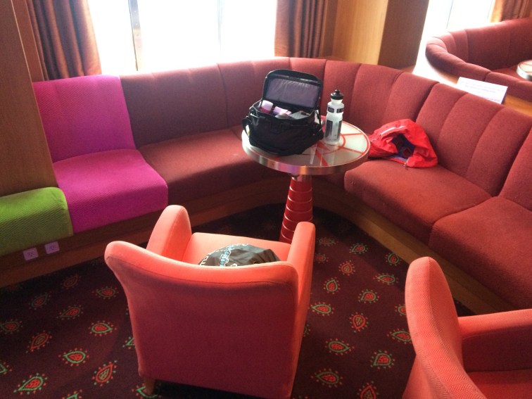 I got upstairs quickly after strapping down the bike on the car deck, and grabbed a nice selection of surfaces in the forward lounge to call my own for the next sixteen hours (the ferry is really not that busy so I needn’t have hurried):