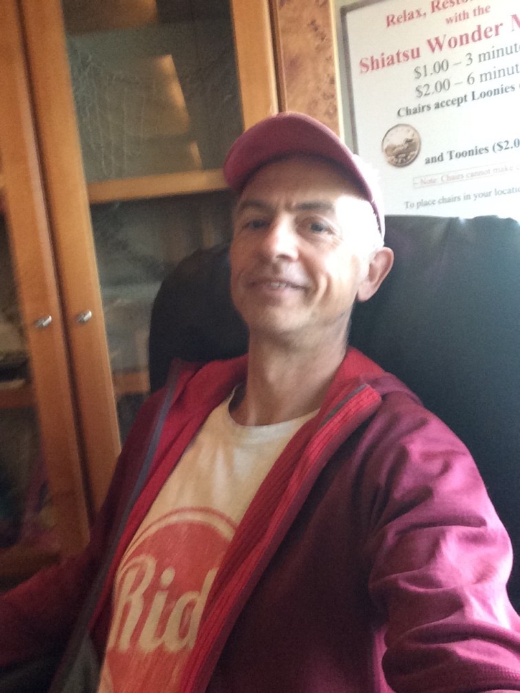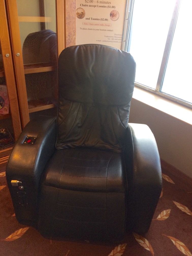 I put my “toonie” in (two dollar coin) and got the longest workout I’ve ever had from one of these chairs. I thought maybe it was broken, but no – I’m heading right back as soon as I get hold of another coin! Such a good asset for a cyclist, or anyone on the road for that matter.