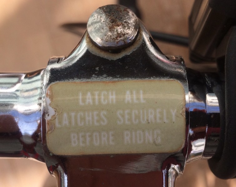 If I spend long enough looking at a ‘new’ bike I tend to find that a plan for using it starts to hatch. Looking at the 31-year-old silver oddity pictured below (which was a very kind hand-me-down gift from our friends Miranda and Chis) got me thinking about finding a suitably odd scheme to go with the bike. Nothing totally confirmed as yet, but it will involve international travel (my flight is booked), returning to and from the same place on ride days for about a month (if all goes well…), and LOTS of water. As in sea water. And drinking water too, probably, since the average summer temperature where I’m planning to ride this original 1988 Dahon Classic III fold-up bike is 31°c, with an average humidity of 87%. And the supposedly “portable” bike weighs over 15 kilos, the same as my steel Hewitt touring bike, the one I rode across Canada. And it only has 3 gears (versus 21 on the Hewitt), and of those 3 gears only 2 seem to be working at present…and it really rattles when you ride it, and can suddenly fold in half underneath you should you forget to click the metal thing shut first. I think that’s everything.A 31-year-old sticker still providing some good advice