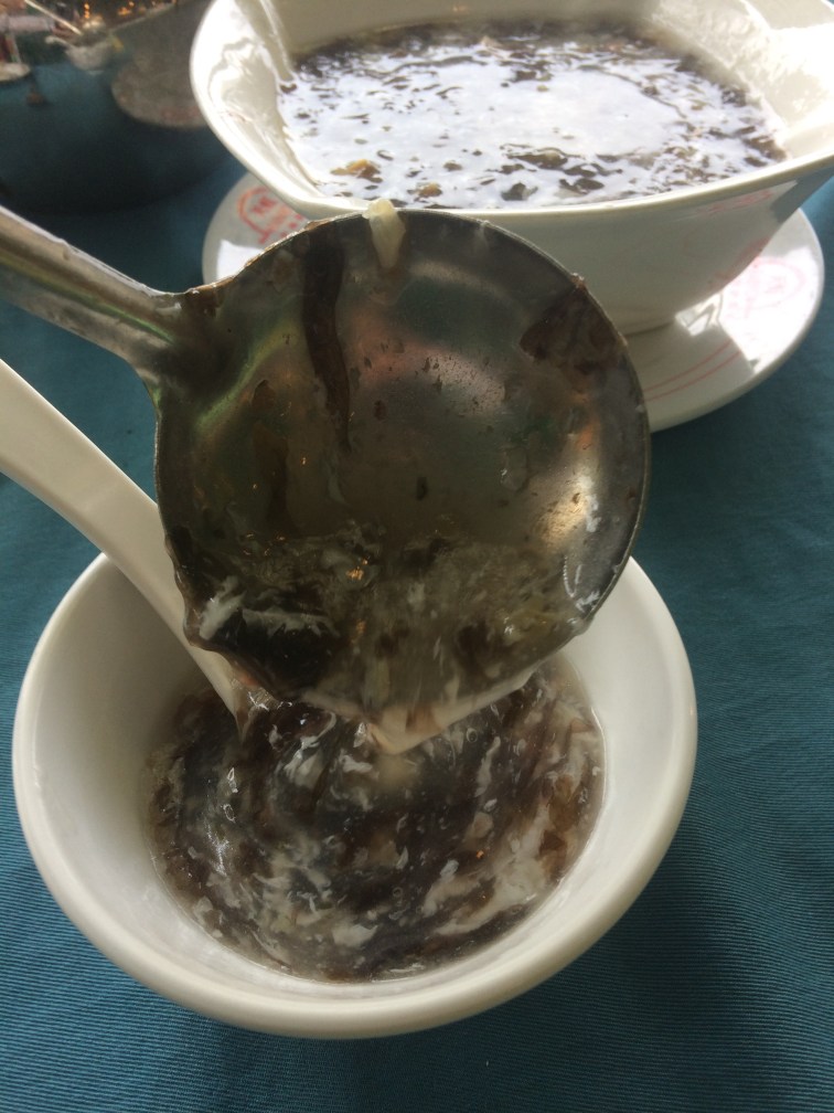 They ask you not to photograph inside, so you’ll just have to imagine the smell of incense, offerings of food and drink to the gods, and an extraordinary case on the wall, about eight feet long, containing a gigantic and rare albino-white Oar Fish caught in the bay in 2001, then given to the Rainbow Restaurant as an offer of friendship, who then donated it to the Temple. Since the Rainbow Restaurant was so at the heart of the community, I chose it for lunch, ordering a coconut water, a pot of tea and a big bowl of seaweed and seafood soup. I know gelatinous Chinese soups aren’t everyone’s favourite dish, but this tasted as beautifully of the sea as a plate of iced oysters in the finest restaurant. I thought it was too much for one, but in the end I could have eaten another bowlful, looking out at the fishermen who supplied it.