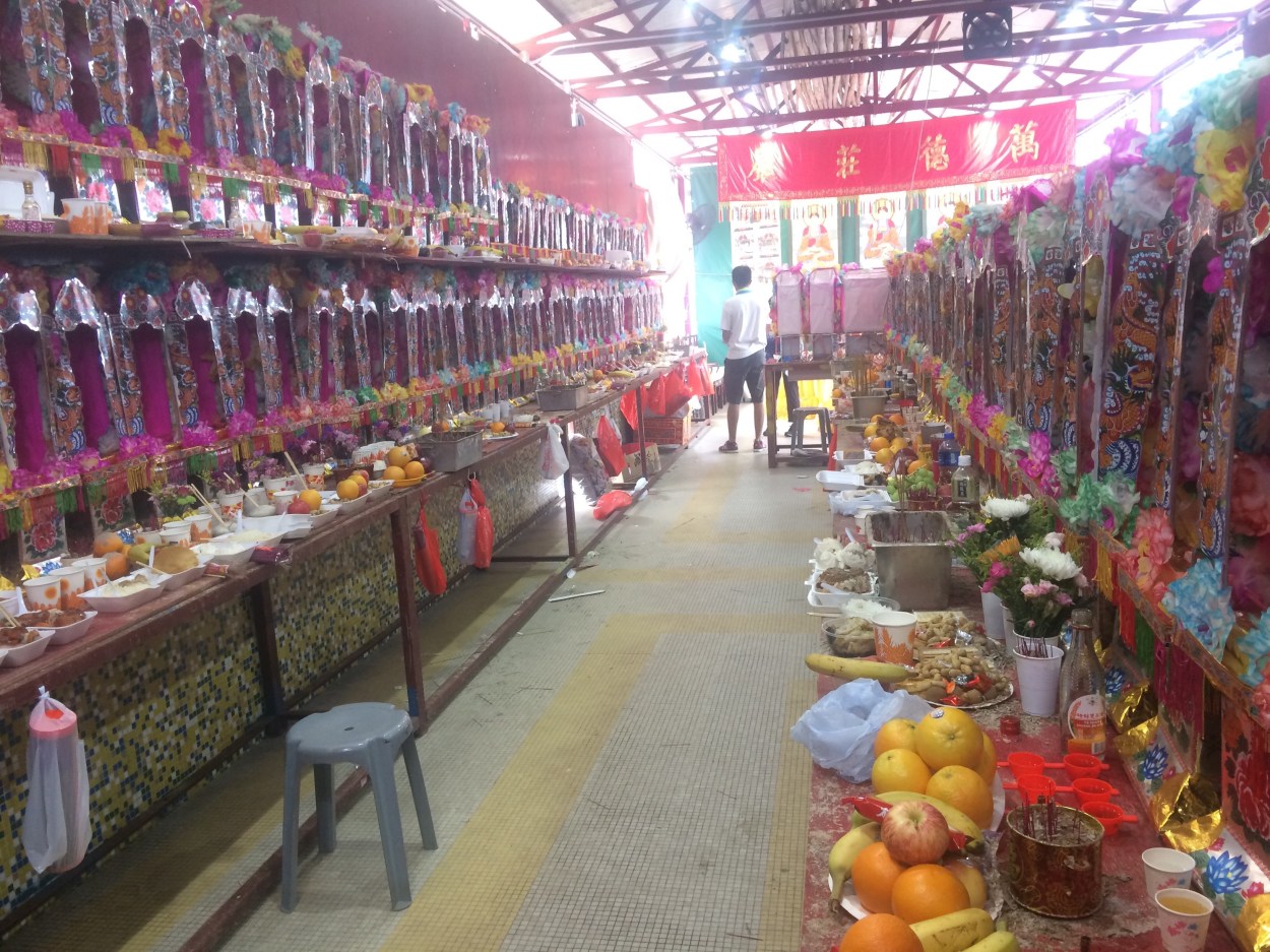 The air was thick with the sound of cicadas, more unfamiliar birdsong, and occasionally the sound of a transistor radio playing Chinese pop music somewhere out of sight. As we passed one hut made entirely of sheets of bare metal, the most fantastic smell of cooking wafted out and we both realised it was well past lunchtime. The path came out at the long beach on the western side, where another big religious festival was underway, or rather being prepared for. Gangs of helpers were folding paper parcels in a precise and intricate way whilst chatting with each other, we hardly passed a single person who wasn’t carrying a large bundle of smoking joss sticks, and there was an enormous paper image of a God, presiding over long rows of food offerings to dead relatives.