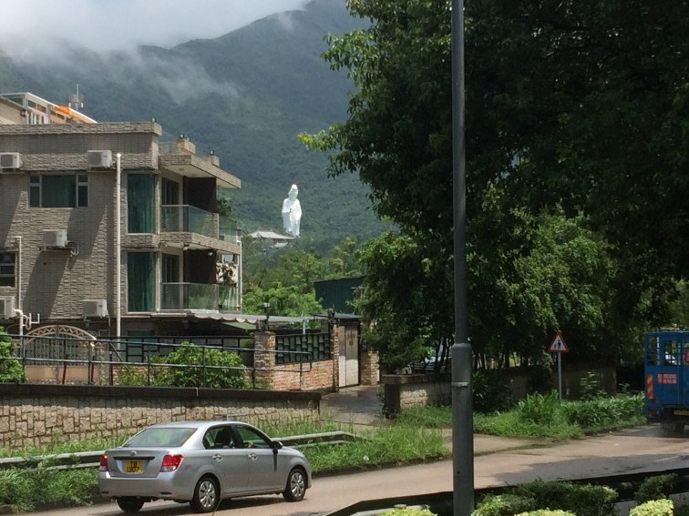 I decided to look out for a turning that might take me up to it. A sign appeared to the Tsz Shan Buddhist Monastery and the Avalokitesvara (Guan Ying Statue), so I left the lovely level path and started to climb. You can see from the stats that I had 1,490 feet of climbing today, and pretty much all of it was riding up the steep road to the monastery. I managed most of it going in a straight line with my legs straining on the pedals, but covered the last stretch weaving back and forth across the road. Once I had got my breath back I spoke to the guards at the very grand gates, who said that I was welcome to visit, but only with a prior appointment (and perhaps a bit less sweaty?). So, with their permission, I had to satisfy myself with just a photo of the incredibly beautiful head of Guan Ying, with the rest of her body concealed by the monastery buildings: