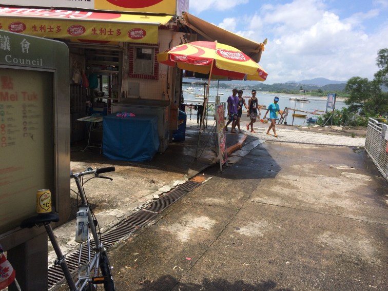 I made a mental note to stop for lunch along here on my way back, then cycled up the only hill on the official cycle route, complete with a sign warning all cyclists to dismount and push their bikes up this ‘dangerous’ incline. I’m guessing that this was more for the covered four-seater rickshaw bikes than anyone else. The last stretch was along the top of the Plover Cove Reservoir dam wall, which took me all the way to the island of Pak Sha Tau (so I really did get to one more island, after all), with huge banks of clouds and torrential downpours making it feel, once again, a bit like being in the Scottish Highlands, if it wasn’t for the heat. I filmed this on the way back: