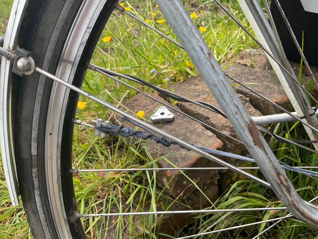 But never mind all that. As I got back on the bike and set off again, I heard a very unfamiliar, loud ‘ping’. I kept going briefly, thinking ‘that’s a weird sound, I wonder what just fell off or broke?’ There was now also the sound of something banging in the wheels, so I decided to investigate. Low and behold, I discovered two flappy bits of metal that used to be one of my rear wheel spokes. This is the first time a spoke has broken on this bike, which is now seven years old and as you know has crossed Canada, so I should be grateful it happened in such a pleasant spot. Luckily, I carry quite a lot of spare bits and pieces, including a clever little Kevlar spoke repair kit that has never been opened. Thousands and thousands of miles just taking up space, waiting for its day to shine. 45 minutes later, my hands black with grease and sore from all the adjusting and tightening needed, I stood back to admire my temporary new spoke.