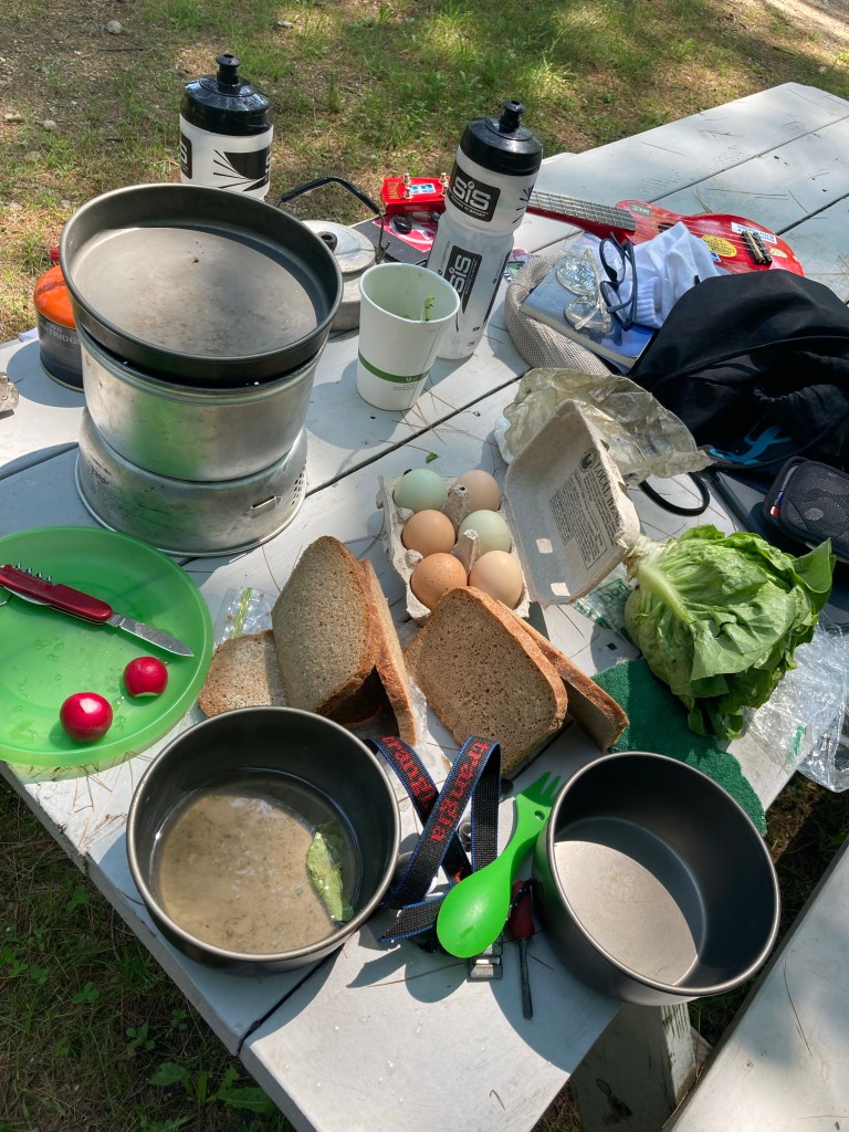 Lunch was French toast al fresco with eggs from the camp’s own chickens, bread gifted by Sandy, and delicious lettuce and peppery radishes from the market.
