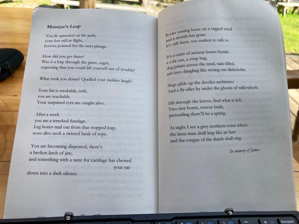 I’m travelling with my mum’s book of poems published shortly before she died, and there’s one I thought I’d share today. It’s about a wild animal she once found dead on a path, when she was a child growing up in Yorkshire, England. I see so many animals like this by the side of the road, that the poem keeps coming to my mind, with its depiction of ‘surprised eyes caught alive’. It’s called ‘Muntjac’s Leap: