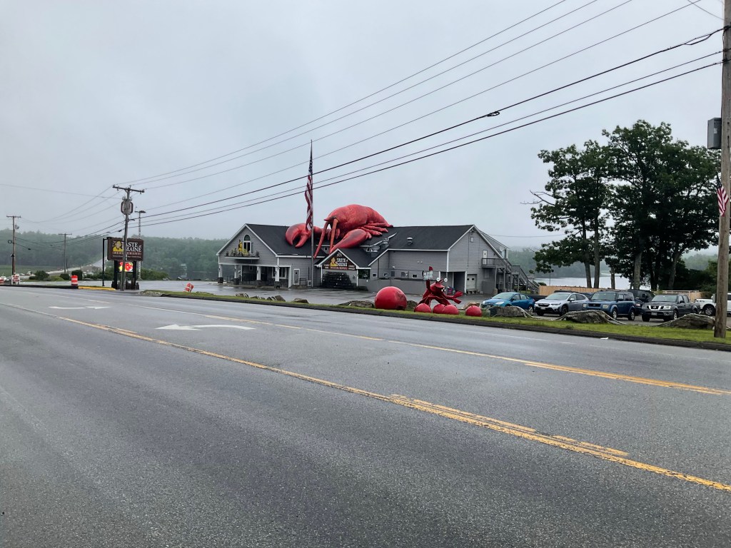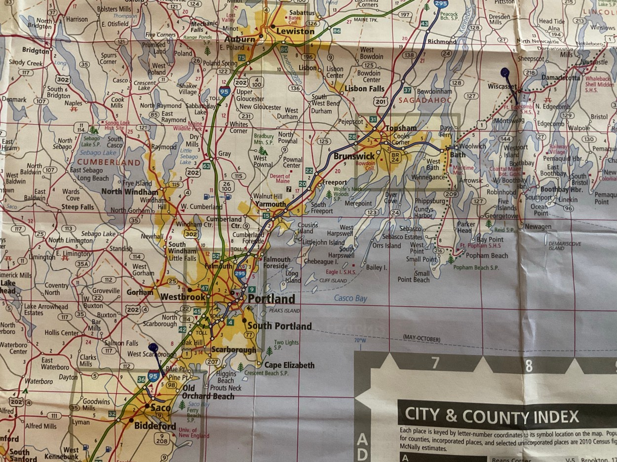 My priority today was to get off Route 1 and try out the old State Road equivalent as soon as I could. The traffic noise on the main highway is awful when it rains. It was a good decision, and turned out to have lots of stopping places. This included 1st breakfast at Starbucks west of Bath, waiting an hour for the rain to let up a bit.
