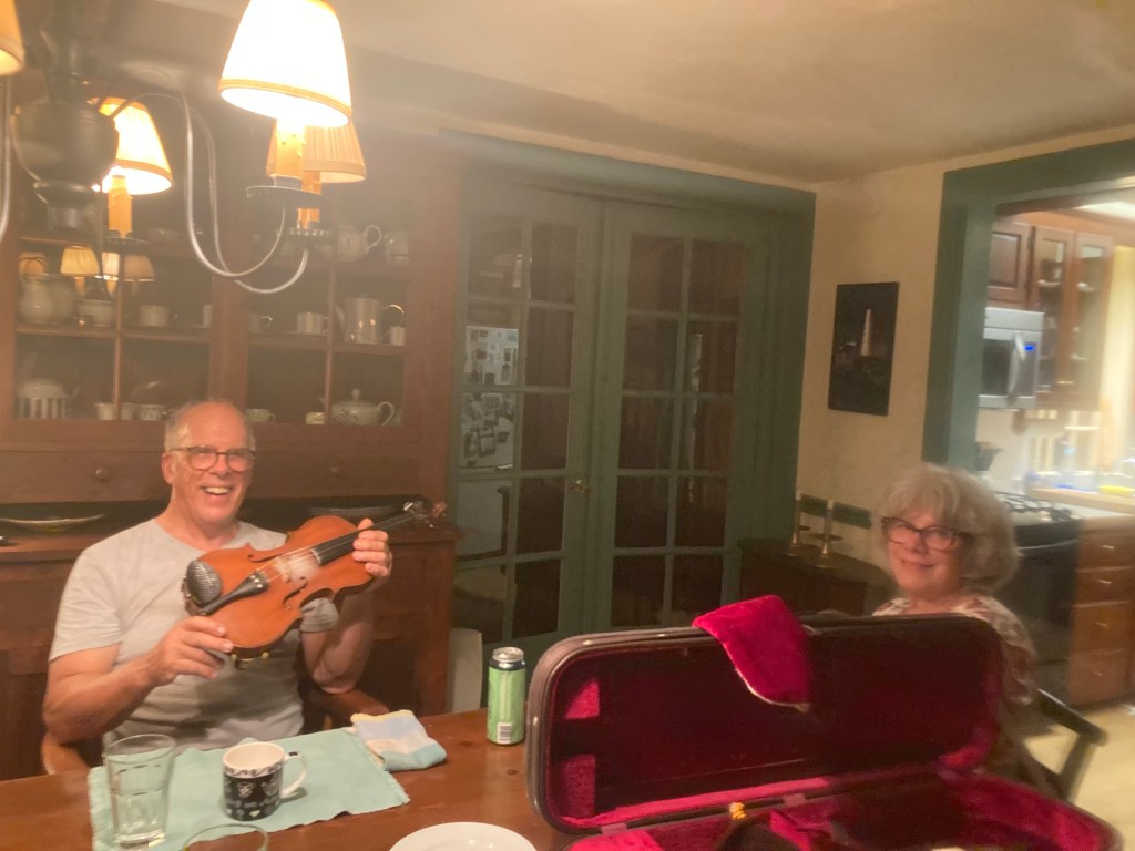 The rest of the ride was in torrential rain for most of the way. I abandoned temporarily when I reached a Garden Centre, but after nearly an hour I decided to just get very wet again. Thankfully my wonderful host for the evening, Richard in New London, offered to meet me at shopping mall a few miles nearer, as the bridge I was planning to use had recently been damaged, and bikes were no longer permitted. I drank a cup of hot tea until he arrived, we threw my bike in the back of his pickup truck, and were eating pasta and meatballs within the hour. Betsy and Richard gave me a wonderful evening, which included a once-over for his nice German violin c1850, and some suggestions for getting it into better shape (clean the strings, Richard, just imagine it’s a bike chain).