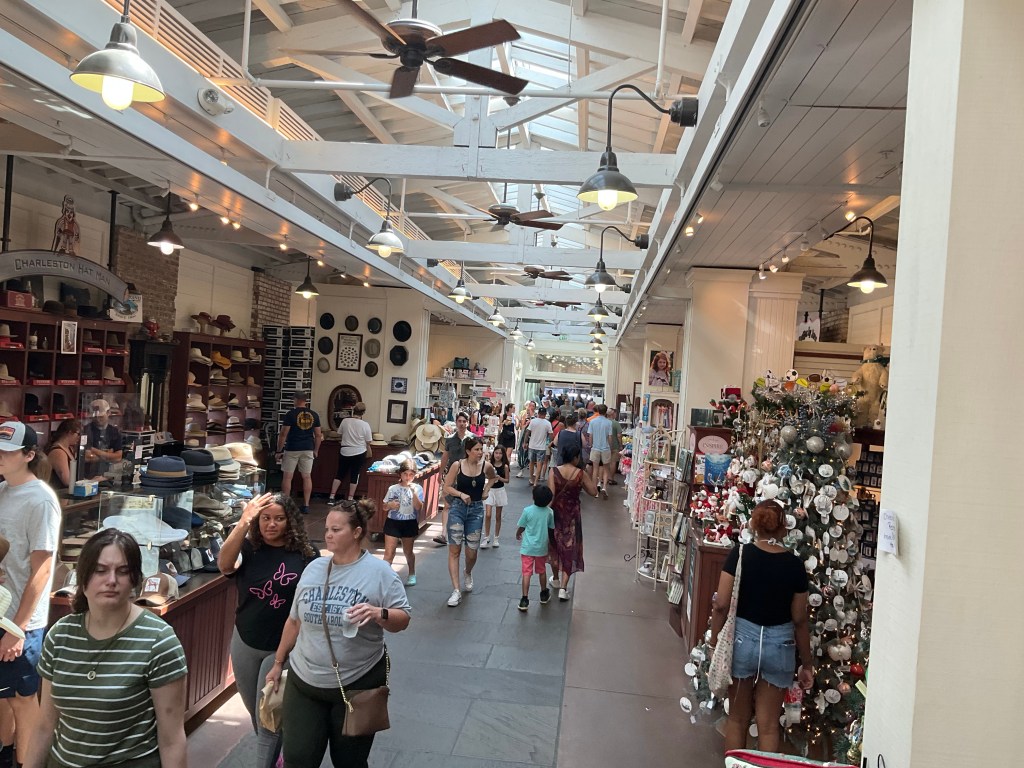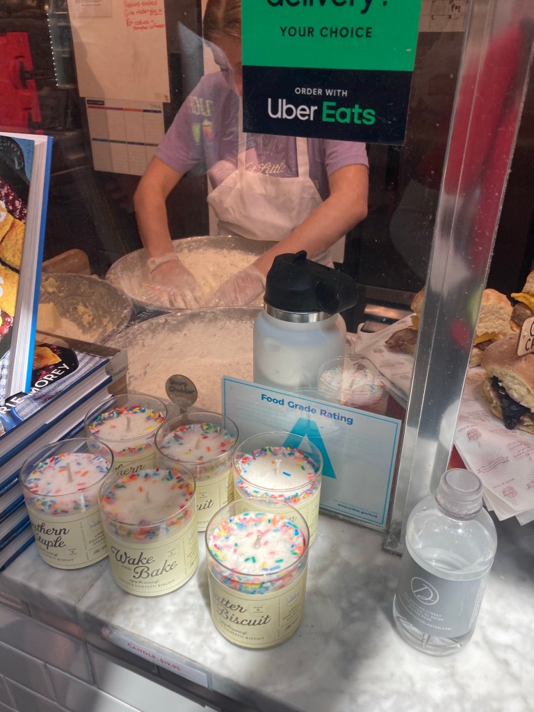 …I walked the whole length of the indoor market, some in a/c and the rest open-sided with ceiling fans. I stopped for 2nd breakfast at the place with the biggest queue, Callie’s Hot Little Biscuit (which we in England would call a savoury scone). I went for their own-blend coffee and a buttermilk biscuit sandwich BLT, with roasted tomato, arugula (rocket) and lemon basil mayo. It was absolutely amazing, and so filling that I couldn’t finish it. I’m still in shock at that. Hasn’t happened since the curly fries/broken till incident in Canada somewhere, back in 2017.