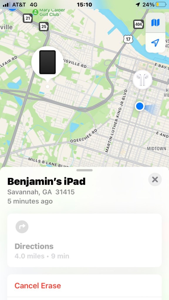 At this point I spotted a Police Squad car. Cycling over to it, I spoke to an officer who was on duty at a city filming location for the day. When I told him my story and explained that I was currently tracking the ipad on my phone, his eyes lit up and he said ‘Great! I’m tied up here but I can still help you Sir – I’ll phone this in and you should just go back to the park cafe and wait for the arrival of another officer’. So that’s what I did. About twenty minutes later, after phoning Susie to explain the problem, I met Officer Johnson. By now, the FindMy app was showing that my iPad had finally finished travelling down the endless blocks of old Savannah and had settled in one place a few miles due west of the park. By now I was thinking, ‘Just get an incident number, try to forget about all of the lost material (aaargh) and claim it on insurance’.