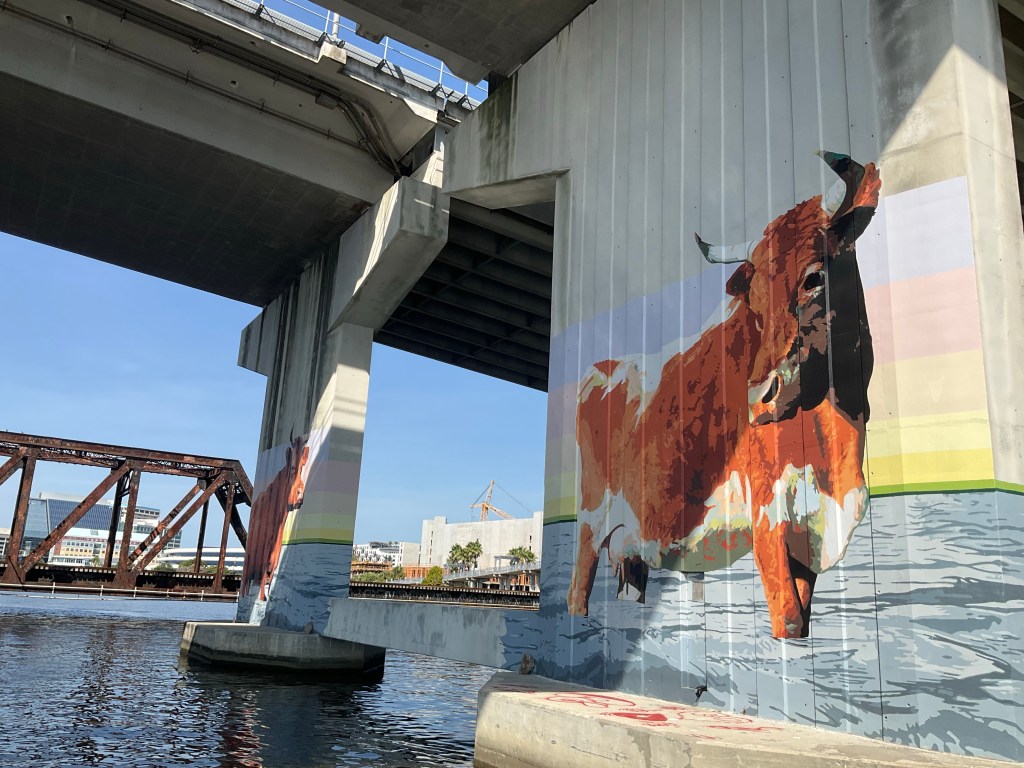 Jacksonville was previously called Cowford (originally Timucua territory) because of settlers using the St John’s river there as a crossing point for their cattle, which perhaps makes sense of the beautiful fresco under the bridge?