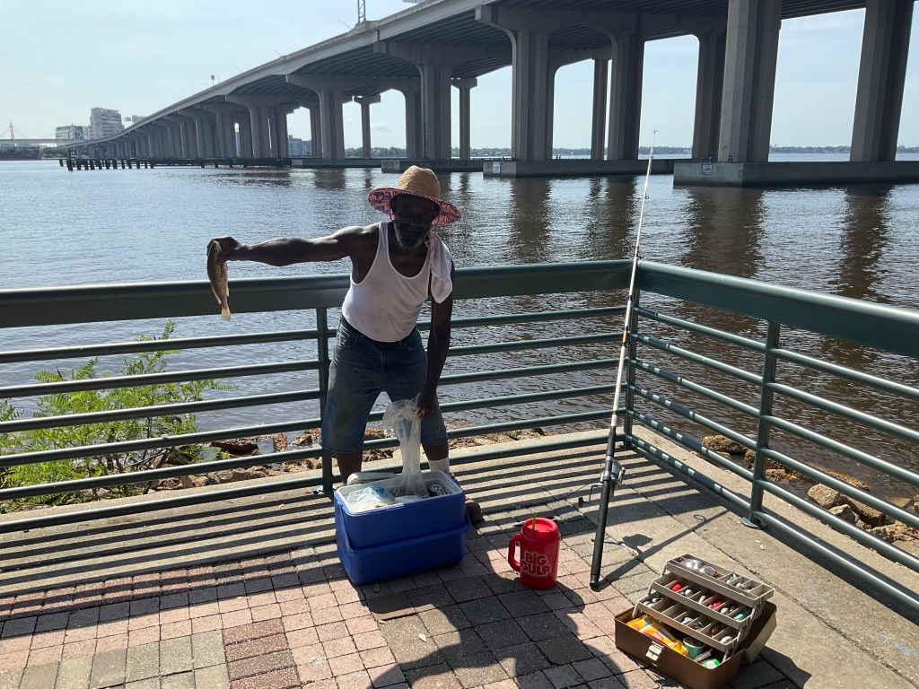 I passed two fishermen, one getting ready to launch his kayak out to his favourite spot under the massive road bridge, and the other with his ice box cooler already almost full. They were both after the same fish, they told me: Croakers.