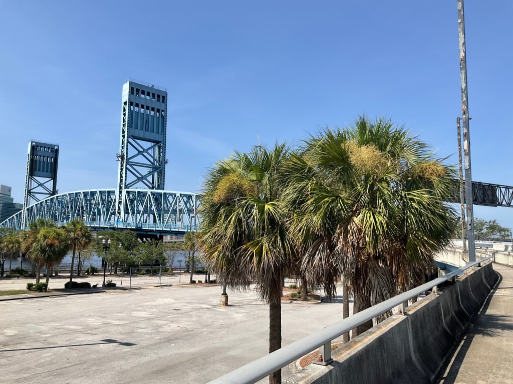 Then as I crossed the Trout River road bridge towards downtown Jacksonville, I heard that iconic sound, the call of an American freight train in the distance. I knew they did that mostly as they passed through railway crossings within a town, and I was right beside the rail bridge, so I stayed put for a couple of minutes and waited to see if it would appear on the river: