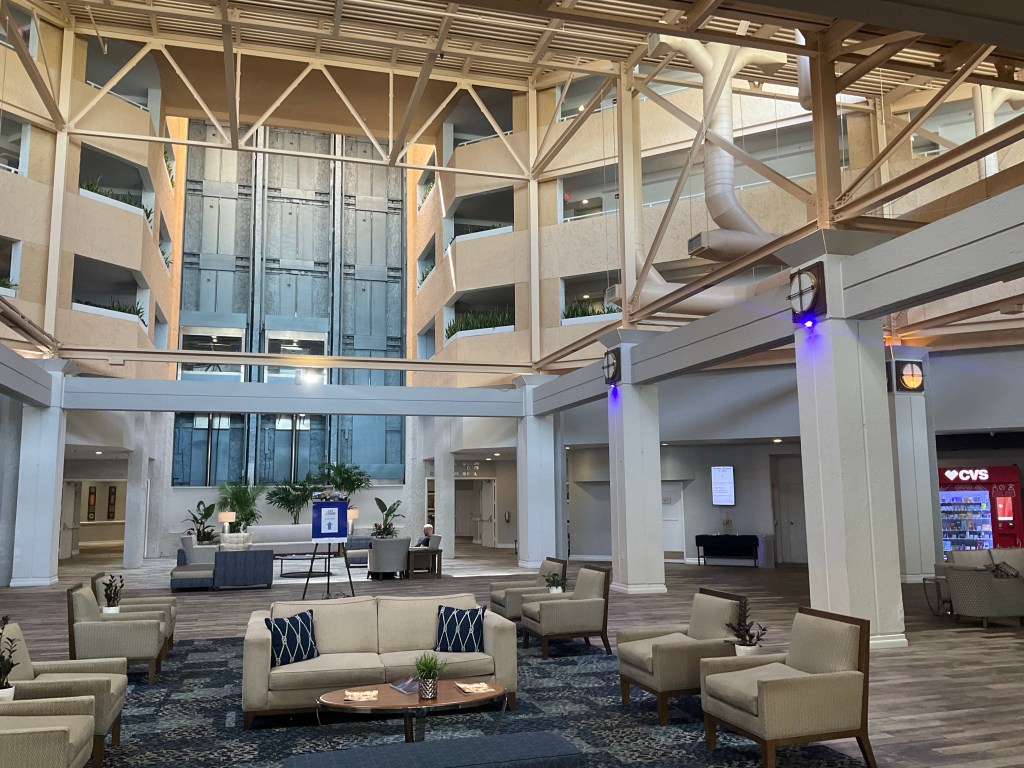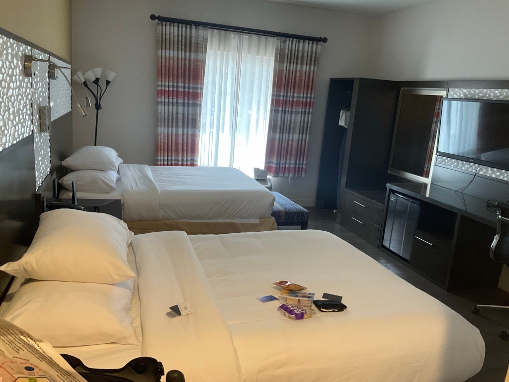 I haven’t yet mentioned a bit of very good fortune I had when planning today’s itinerary. I always scour motels on Google maps, as I find it a great way to spot last minute deals, or compare prices without visiting loads of websites. This trip has involved far more of this sort of thing than I ever expected it to! Anyway, in the conference centre quarter I noticed a crazily low price for a high-end Marriott hotel, clicked ‘Make a Reservation’ and got myself a luxury room for boiled peanuts. Less than many run-down motels I’ve stayed at on this trip, and quite a few campsites too. After all the very basic rooms I’ve had*, with broken or absent facilities and empty pools, as well as a few pretty inadequate campgrounds, it was the first time I felt a bit like I would on a Concert Tour, when places like this were the norm. I may be spoiled for the next few stops.